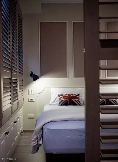 窗边百叶窗的设计可以随心变换整个房间的明亮度,而卧室门也是以百叶式折叠门来打造,平时既能让这间卧室具有开放式的格局,又能随个人需要来关闭折叠门,但因为是百叶式的设计一点都不会影响到屋子整体的空间感。