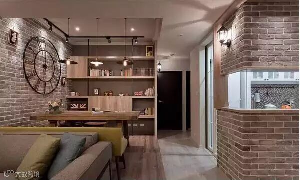 入门玄关进门就能看见半开放式的厨房以及休闲的用餐区,以灰色砖墙打造出来的墙面将这一空间打造出了一种粗犷的精致感,在用餐区作了地台的设计,以划分整个用餐区空间,平时也能够把这边当做一个阅读空间来使用,所以我们就在一旁的墙面上作了木质书架,可以收纳不少书籍在这边,对于日常使用上也是较为便捷的。