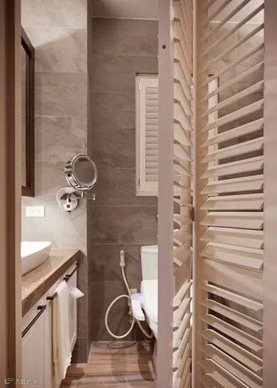 卧室中带有一间卫生间,乳白色的折叠门同样选用了百叶窗的样式,使这间卫生间从外面看起来就显出一份干净整洁。