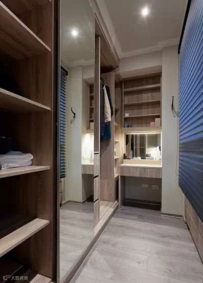 衣帽间中利用墙面空间作了整体式的衣橱设计,大镜面的移门设计不仅能够让这一空间看上去更具有扩容的效果,平时更换完衣物后照一下镜子也十分方便,可谓是一举两得。