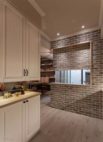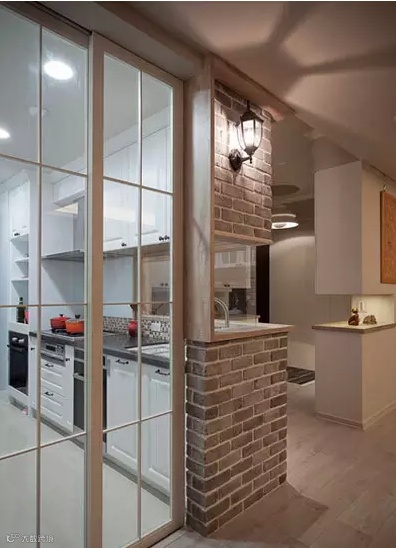 选用白框格子移门来作为这间厨房的空间隔断,厨房门口的砖墙上的小壁灯是不是很有英伦风的感觉呢?暖色灯光散发出来,光影映射在天花墙面上,为屋子中增添了不少家的温馨。