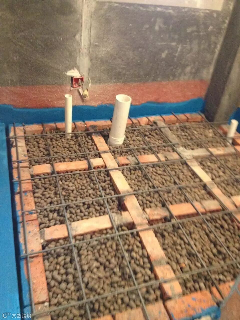倒制混凝土层,40毫米厚度的细石混凝土找平。此层要做泻水坡,做两遍防水涂料,连墙体一起做,防水层干了之后,要刷一遍素水泥浆保护,以免铺地砖和贴瓷片时刮伤。保护层干了之后才能上人和做下一步的瓷砖铺贴工作。