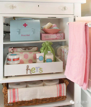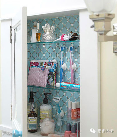 在你的柜子里不要浪费一寸的储物空间,在柜子的门上安装上毛巾架,挂上毛巾。将物品都放在篮子里,既方便拿取又使东西能摆放井然有序。