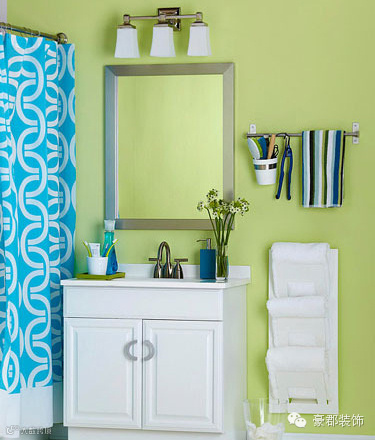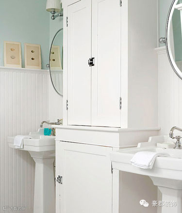 将洗漱台下面的空间也利用起来,作成一个小抽屉,而抽屉上面则放上置物篮。洗漱台的两边也利用起来,作成二个储物柜,分为多个隔层,指定几个隔层给每个家庭成员,既合理又整洁。