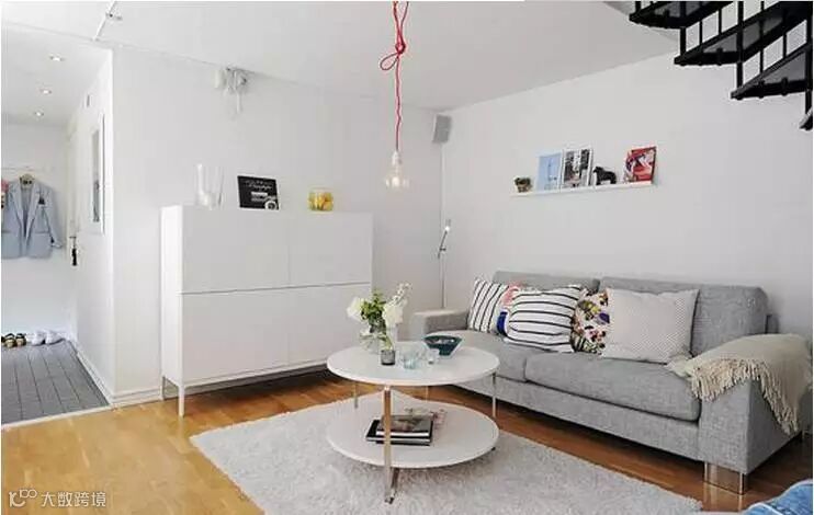 沙发处铺上灰色地毯,给白色地板带来了一点不同。