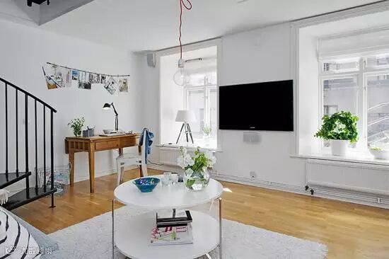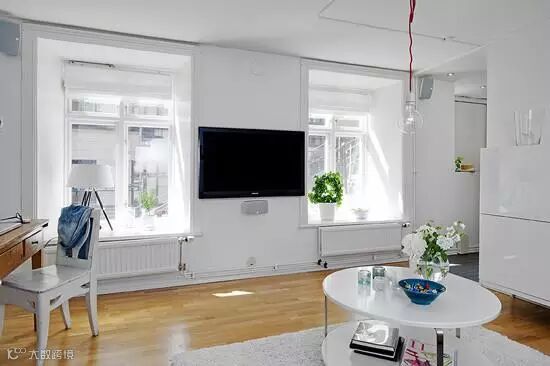 客厅里没有设计一个电视柜,而是将电视挂在两扇窗户中间的空白处,节省空间的同时又不失美观。