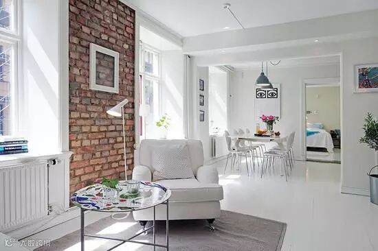 楼上是白绘木地板,客厅的部分墙壁是经典的红砖,没有任何修饰,但却很好地和白色的木板、墙壁、沙发融合在一起。