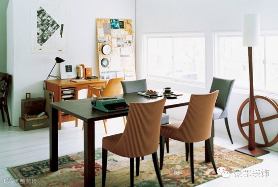 该餐厅运用了墨绿色和土黄色的对比色,冷色调与暖色调形成一定的对比,但是却因为色彩明度都比较低所以并没有觉得这样的对比很扎眼。因此如果选择对比色布置空间的话,最好颜色色彩的饱和度和明度尽量统一在一个水平上,否则容易搭出乱糟糟的感觉,色彩会显得太跳跃。