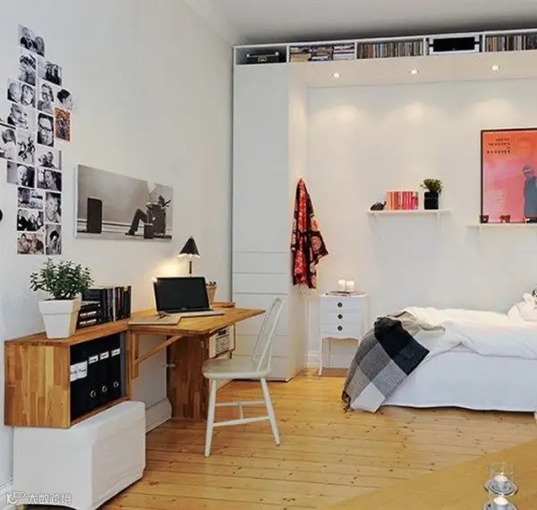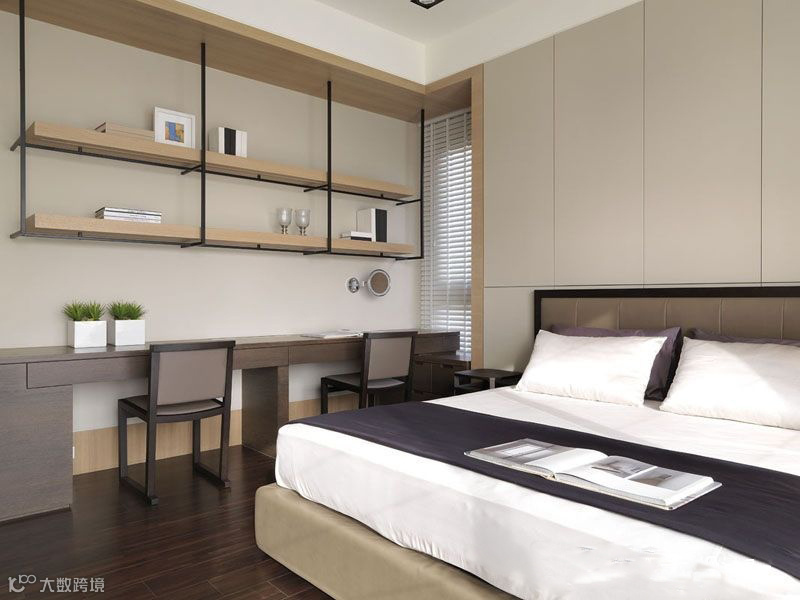 主卧里除了摆放睡床之外,也是可以利用墙面收纳,完全有能力挤出书房的空间来的,达到休闲办公两不误的效果。