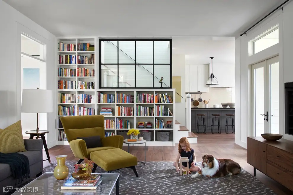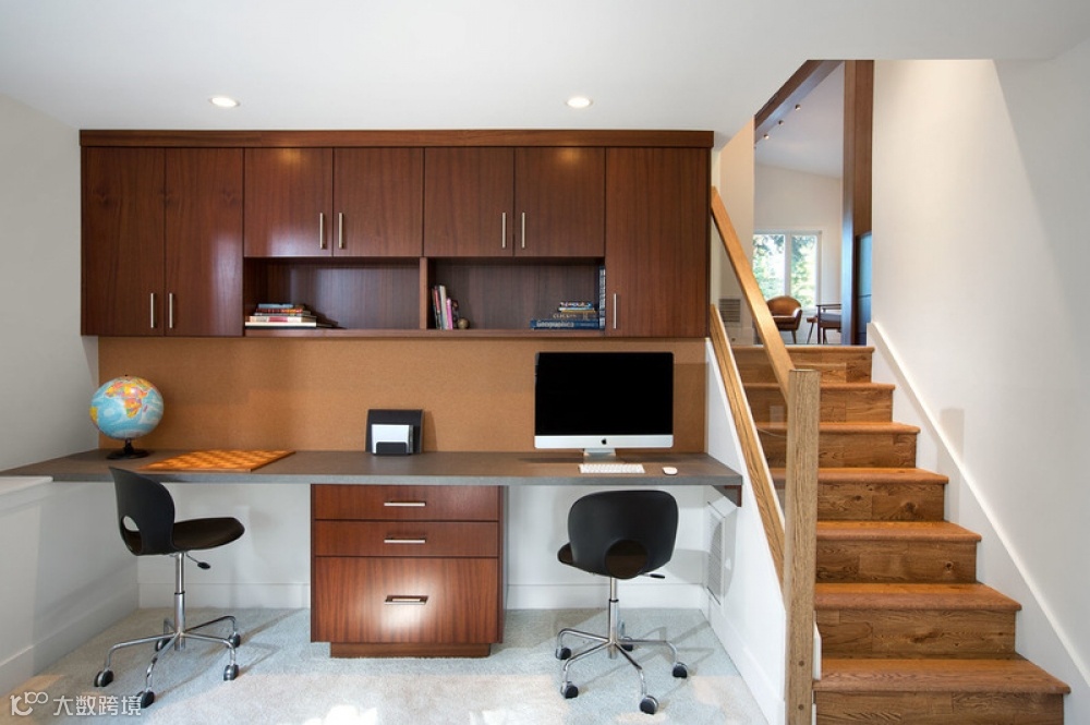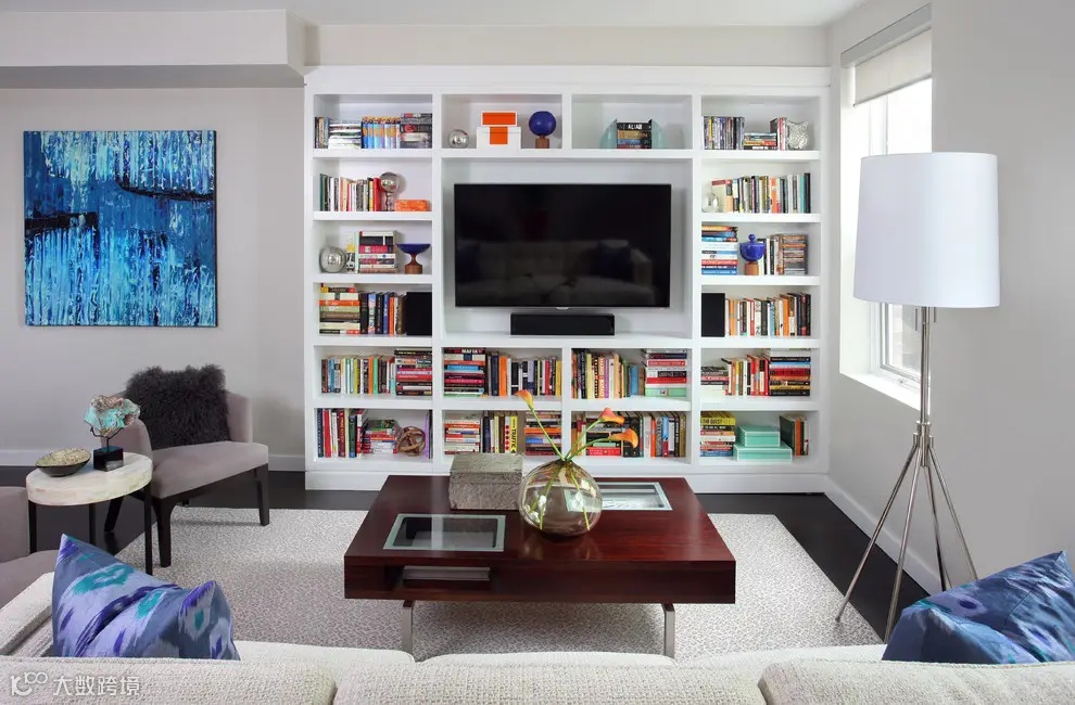 客厅通常就是主人休闲、会客的地方,若是在此处安置书房,最佳位置就是电视柜旁了。无论是与电视柜成直角摆放,还是并排而放,都是极好的利用空间了。而且考虑到整体效果,书柜与电视柜组合在一起也是毫无违和感的,并不需要担心画风突变的问题。