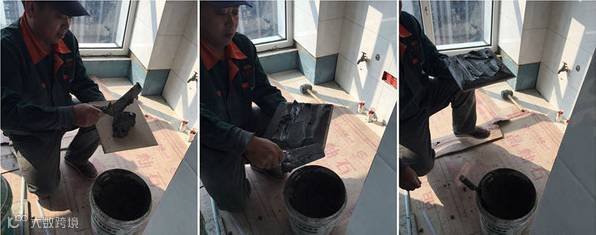 第三步:先将瓷砖胶涂抹在切好的砖上。
