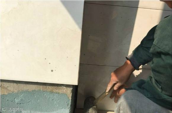 第五步:用锤子再次敲实。近距离观察下师傅的手艺,整整齐齐,最后将十字夹扣好,固定瓷砖之间缝隙