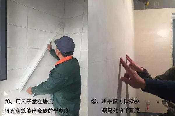 第四步:贴到墙上挤压平整,防止出现空鼓的现象!这一步手感是很重要的,只有有经验的师傅才能保证瓷砖铺贴平整,没有空鼓。
