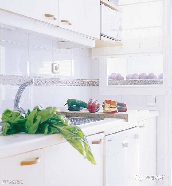 厨房以一整片白色呈现于眼前,从整体橱柜到墙面瓷砖都充斥着象征纯洁的白色系。