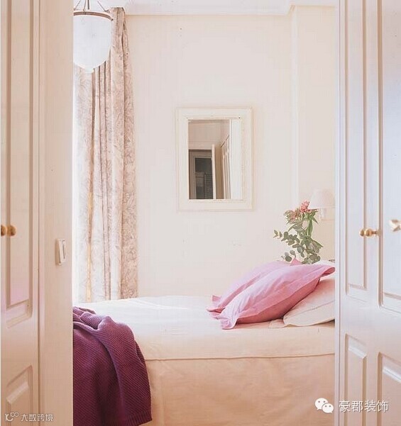 嵌在墙面上的白色床头小灯为床头柜空出了不少空间,另外还有一面简洁的矩形镜子嵌在窗边的墙面上,不仅为空间视觉上增加了扩容效果,也在平日生活中带来较强的实用功能性。