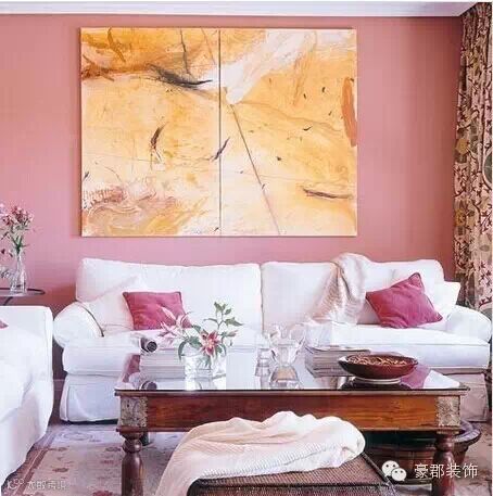 整个客厅都被大片温暖的枚红色包围,沙发背景墙上挂上大幅的抽象油画作为空间装饰,纯白色沙发放置与客厅中,显得尤为纯净,寓意美好新生活的开始。