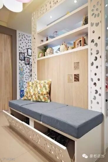 鞋柜若能舍弃背板,并加上悬空设计,通风效果就会非常好,另外,内部层板不要顶到底,留一些空隙便于透气,门片也可透过挖空造型辅助通风,但镂空的孔洞记得要留在上下位置,才能有效帮助空气循环。