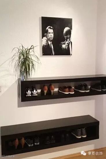 鞋柜下方的悬空设计,可置放进屋时脱下的鞋子,能先让鞋子透透气,等味道散去再放进鞋柜,同时也解决鞋子堆在鞋柜外的杂乱,下雨天的湿鞋子也可先暂放在此,等阴干后再收进鞋柜,平时则可摆放拖鞋,方便回家后穿拖,而鞋柜悬空的高度建议黎地25公分为佳。