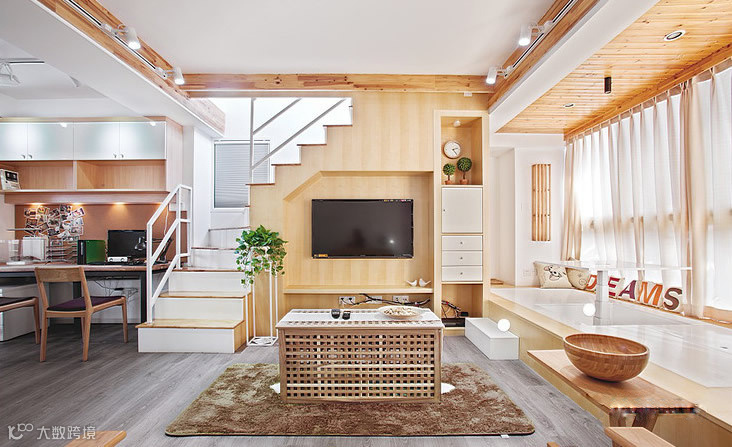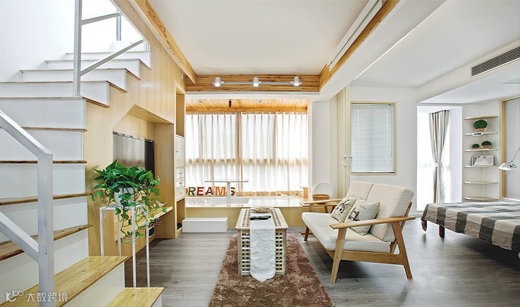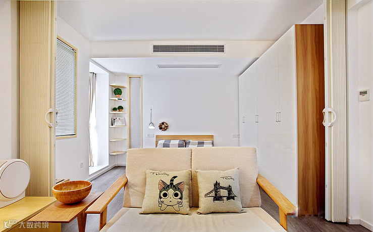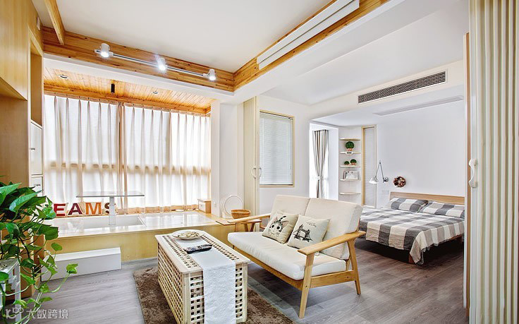 整个空间充满森林系自然原木风,现代简约带点MUJI带点宜家风格,清新自然。沙发后面就是卧室。