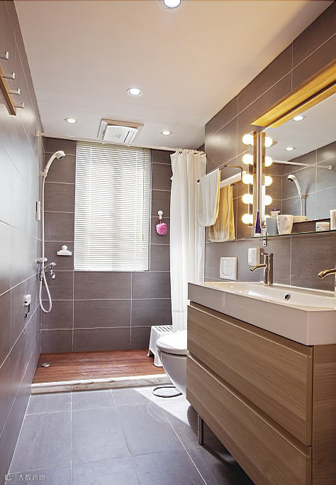 与厨房色调相反的是深色调的卫浴间。用浴帘简单又自然的隔断淋浴间与卫生间。