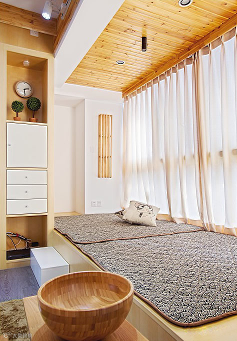 窗台做了可升降的榻榻米,可收纳可打牌,是一个休闲娱乐的好地方;升降桌隐藏之后就是平常的飘窗,适合休息。
