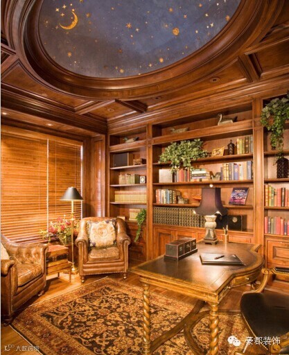 吊顶除了常规的款式,还可以融入小心思,呈现出多变灵活的别致头上风景。常见的凹凸式吊顶,考虑整体美式风格的特点,材料也偏爱木质,中心位置的圆形搭配周围辅助拉线设计,视觉感极为丰满。神来之笔自然是手绘的天空图,巧妙利用圆形样式,将想象中的天空夜景绘制之上,用以书房,充满浪漫的想象力。