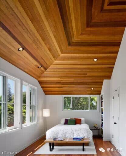 不规则的房间,除了地面跟立面空间利用要花费不少心思外,天花板位置自然也是要尽力做到最好。大面积平面式木质吊顶完成了整个天花板的设计,两面顶墙的利用拼接的毫无缝隙,呈现出大气流畅的视觉感。这种长条的竖状木板大面积有规则的拼接,拉伸空间视觉感!