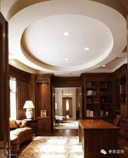 这款吊顶的造型稍微复杂,外围一圈石膏板格成的格子,内力大大的圆厚重沉稳,在将筒灯安置期间,明媚动人。如果在风格上有特殊的要求,书房同样可以做圆形或者多边形的吊顶设计。设计风格尽量选择简约时尚,可以进行细致的修饰,运用不同的块面作对比能够营造一种低调奢华的典雅格调,含蓄而富有活力。