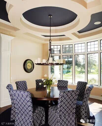 吊顶不是独立的,一定要和空间整体相呼应。一般而言,方正的吊顶下方最好也对应方正的家居摆设,圆形的吊顶下方则可对应圆形或椭圆形的餐桌。在色彩选择方面,最好的方法就是吊顶选择白色,可以用各色灯具进行装饰。