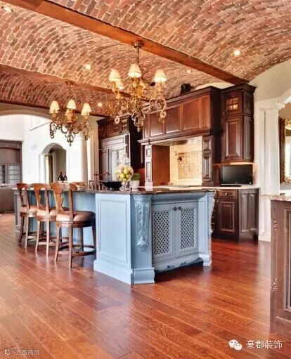 美式乡村的别墅,吊顶采用了相对复杂的陈设。悬挂式的木质吊顶,线条流畅却异常复杂,拱形图案搭配方形纹路,有棱有角,更为耐看。