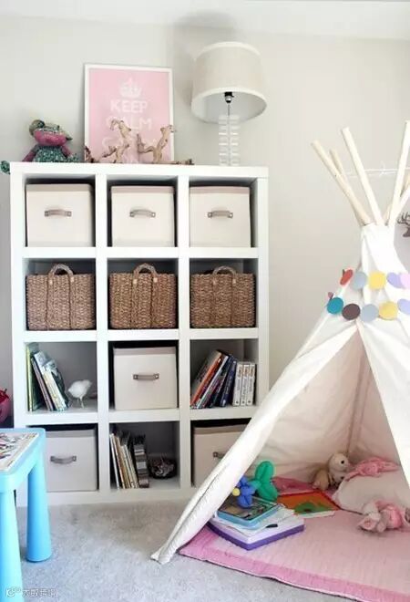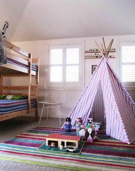 如果卧室里有足够的空处,不妨搭建一个家庭装的小帐篷,适宜给亲戚朋友的孩子搭建这样有趣的小卧室,也不怕直接睡在地面上会被蚊子叮咬等问题。