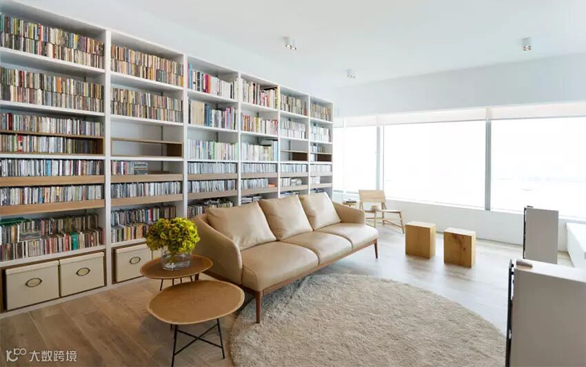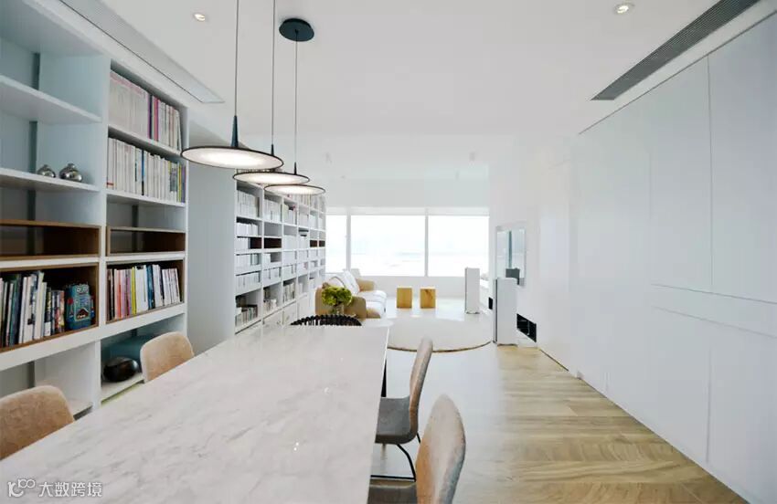 ▲ 空间以白色为主调,所有线条都干净利落,整面书墙增加了整个房子和主人的人文气质