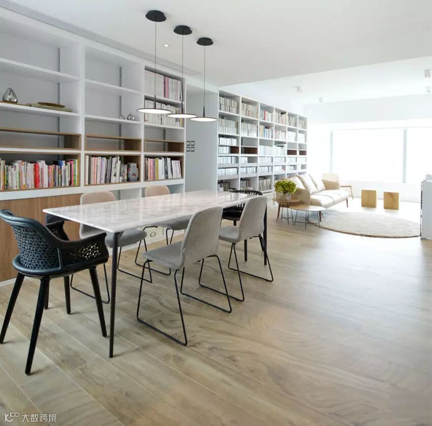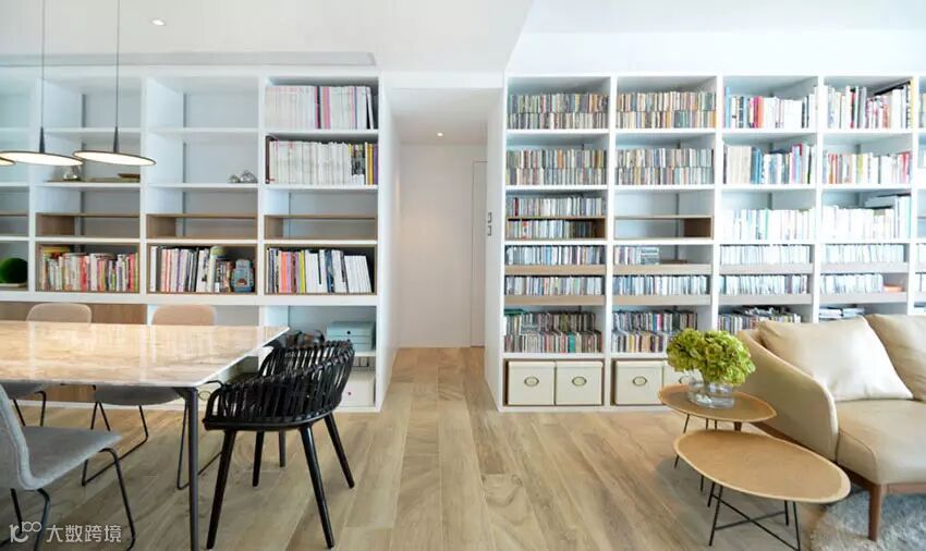 ▲ 餐厅和客厅除了空间宽敞,光线极佳之外,整墙的书柜是特色