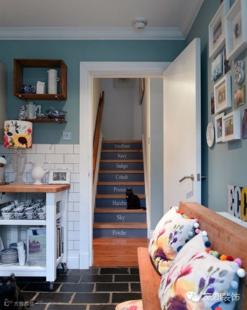 是位于客厅的一个角落,挂满了照片,乱乱的感觉很棒。抱枕很有特包,下面再作介绍。还是客厅,非常喜欢这里的配色,淡蓝色的墙,黑地砖,白色的门以及相关的装饰都是白色的。左上角的收纳设计,值得学习,这样的装饰框装饰性非常强。
