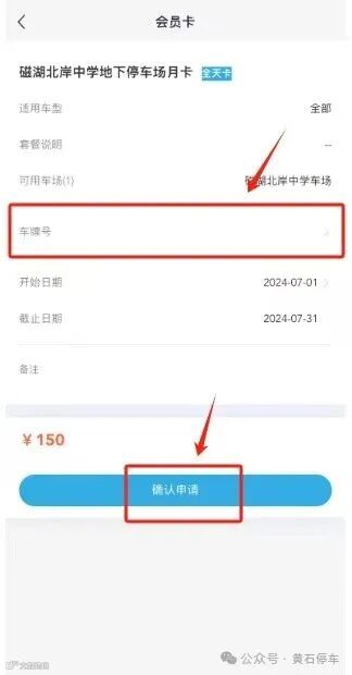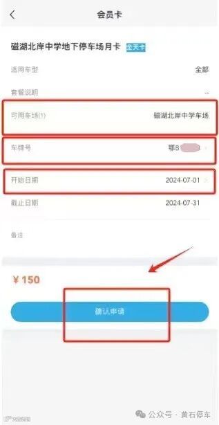 8、核对会员卡信息“可用车场”、“车牌号”、“开始日期”无误后,点击“确认申请”。支付成功后,智慧停车场会员卡完成办理。中途如遇任何问题,欢迎拨打黄石智慧停车24小时客服热线“0714-6212345”咨询。