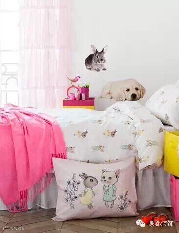 装饰TIPS:猫咪和兔子图案的床品,是每个女孩子无法拒绝的童真,大量布艺的加入,让气氛变得细腻柔和,墙上的狗狗和兔子墙贴,更是萌趣十足。
