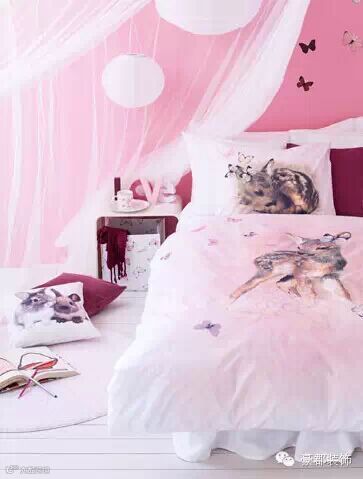 装饰TIPS:在粉色梦幻风格中加入动物元素,让原本甜腻的小女生风格变得更加自然可爱,粉白色兔子和麋鹿图案的床品,搭配轻柔帐幔,还有蝴蝶图案的墙贴,圆了小女生的天使梦。