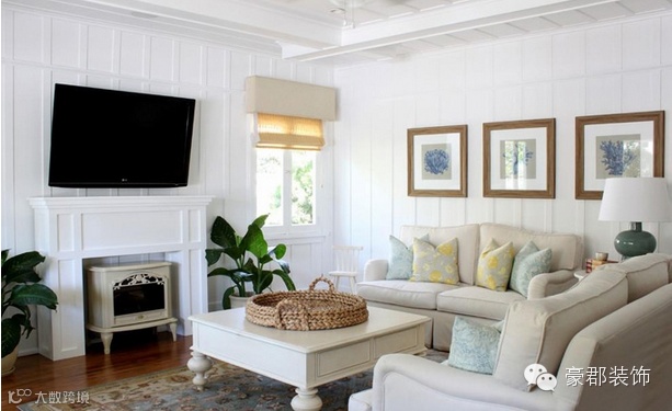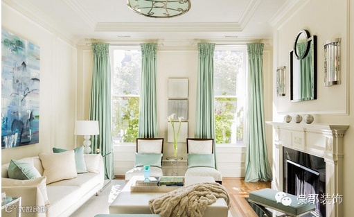 浅浅的绿色以条纹、花纹等形式运用在沙发、毛毯上,让整个房间都笼罩在淡淡的冰凉之中,清新自然。