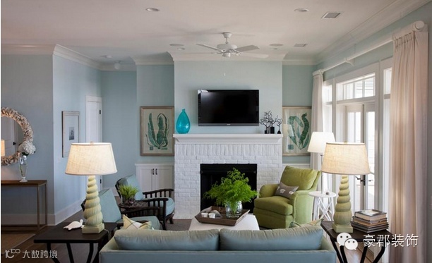 蓝色、绿色沙发与墙壁和盆栽的色彩互相映衬,让空间的色彩搭配更加和谐美丽。海螺状的台灯一左一右,对称也是一种美。