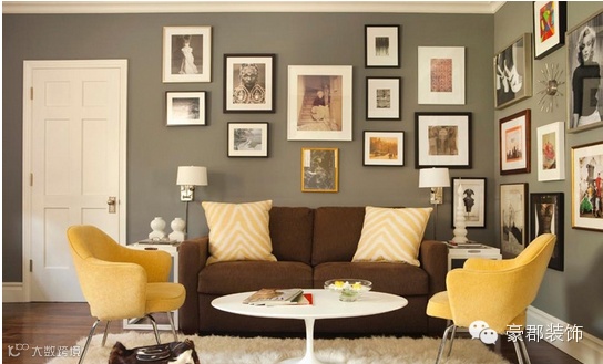 墙壁布满大小不一的照片,显出主人的时尚品味。深咖色的双人沙发柔软舒适,两个黄色条纹抱枕色彩鲜明,整个客厅沉浸在一种优雅的氛围中。
