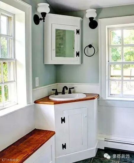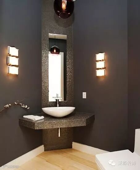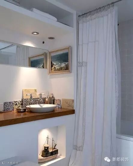 下沉式台盆,屋主将墙面做了小处理,自己砌除了一个跟墙面弧线保持一致的台盆柜,还能做简易收纳,十分便利。再将台盆安置其中,不占空间的转角设计你也可以。