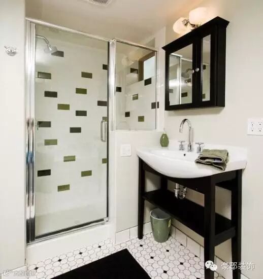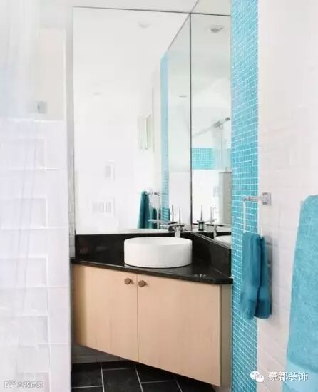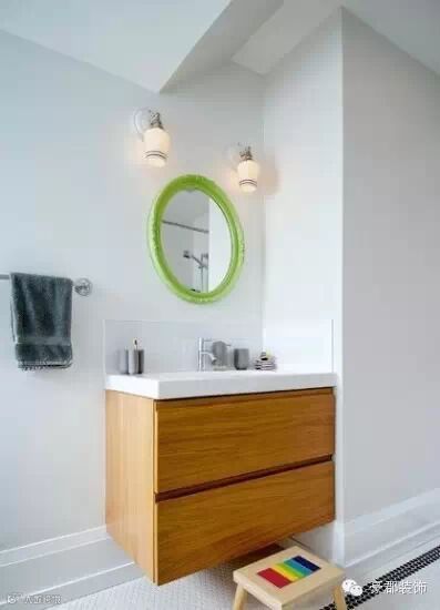 圆形的简易外观,让台盆看起来多了一份现代感。白色设计能很好地融入到室内空间氛围,不会觉得突兀。台盆借由卫浴柜,搞定转角自然没问题。转角处的两面镜子设计也值得借鉴哦。