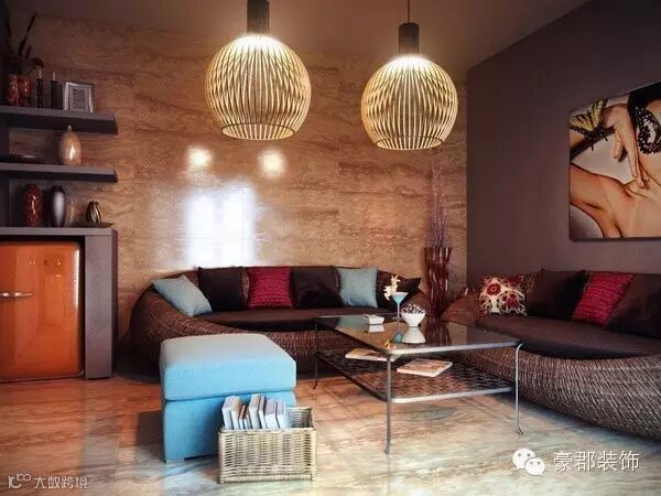 沙发和墙体的颜色相映衬,中间再用其他颜色的点缀,整个客厅空间就丰富多彩了。墙上的黑白时 装饰画和那两个吊灯装饰,时尚感凸显无疑,营造了一个时尚而静雅的婚房客厅。