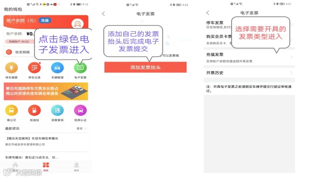 2.电子发票申请方式:登录“黄石停车”APP-车辆管理-添加车辆-上传车辆资料-提交审核(1工作日)-完成审核后-电子发票-充值发票-添加发票抬头-新增抬头-指定邮箱-打印电子发票。