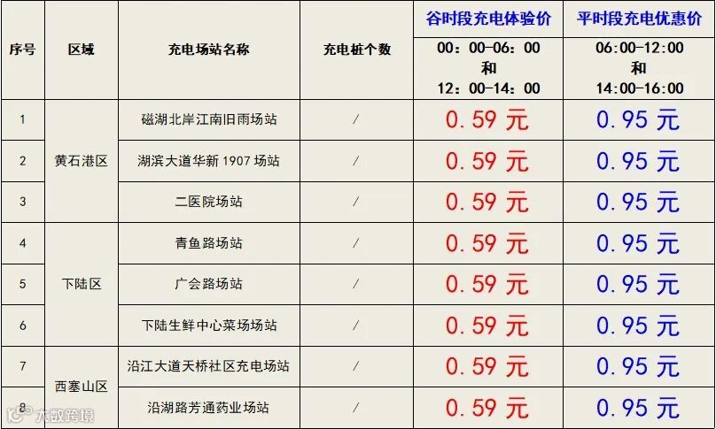 2.磁湖北岸江南旧雨等8个充电场站开展充电服务谷时段(00:00-06:00和12:00-14:00)特惠体验价0.59元/度、平时段(06:00-12:00和14:00-16:00)优惠体验价0.95元/度。(详见附表)
