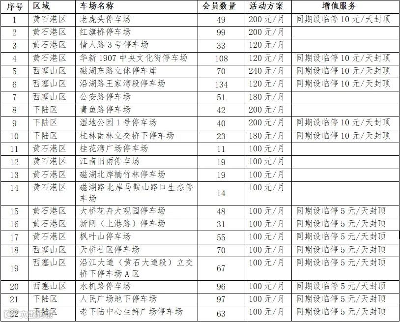 活动内容:为保障中心城区“停车惠民”服务质量,智慧停车公司持续为市民提供中心城区如下表22个封闭停车场(共1239张)月卡会员特惠服务,提升市民出行幸福感。(部分车场临停还可以享受每泊位每日封顶5元或10元的特惠价哦!)