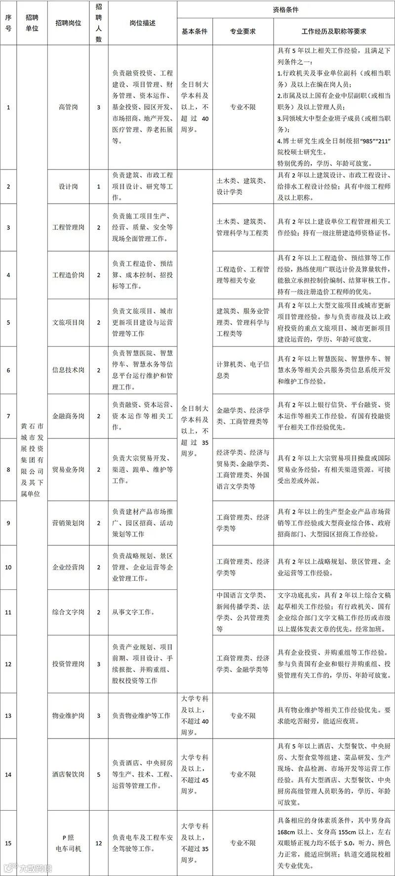 报名者应符合《黄石市城市发展投资集团有限公司2024年春季招聘岗位表》规定的基本条件、专业、经历等各项要求。