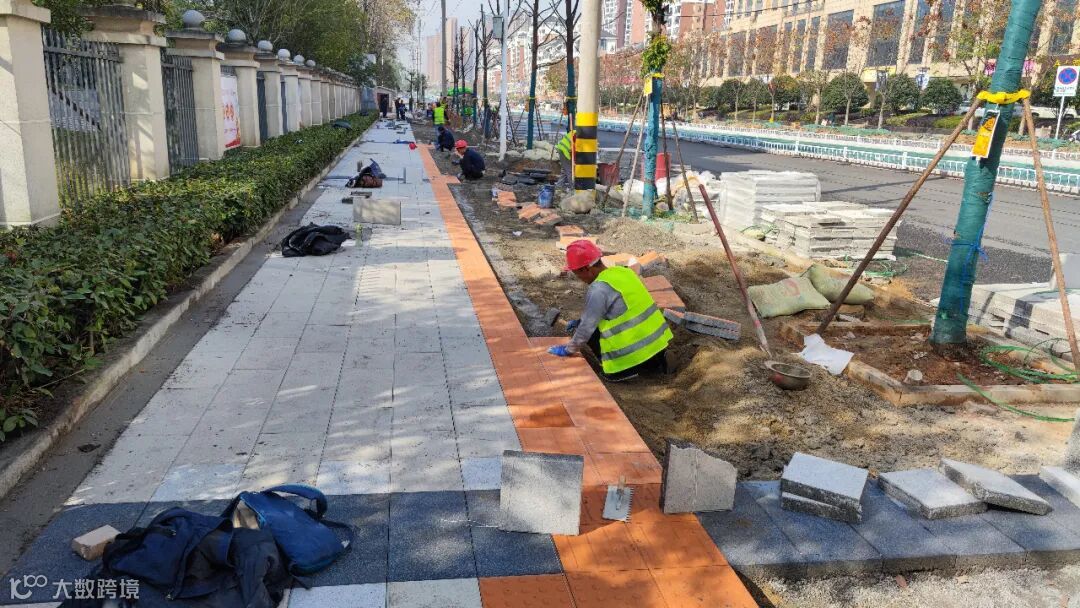 11月24日上午,在苏州路黄石市现代有轨电车项目二标段,工人师傅们正在紧张地进行人行步道砖的铺设工作。这些美观大方的步道砖,正是黄石市环投再生建材科技有限公司生产的最新产品仿石透水砖,其主要特点是耐磨抗压,透水性强,它能将水分吸入砖体之后,再通过自身排到地下,有效防止水分挤压在路面上影响行人交通,为海绵城市建设增添一份力量。
