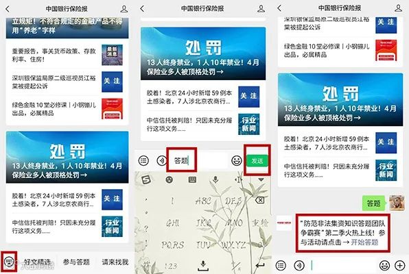 已关注的用户发送关键词“答题”到公众号后台,点击自动回复中的“开始答题”,即可进入活动页面。(答题过程中如遇试卷失效,重新发送关键词“答题”到公众号后台,即可获取最新活动链接。)