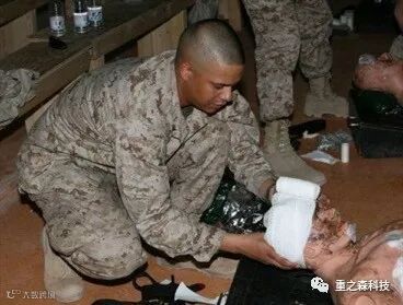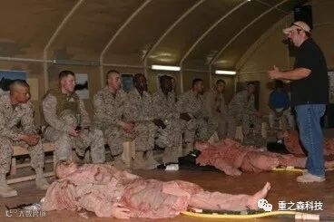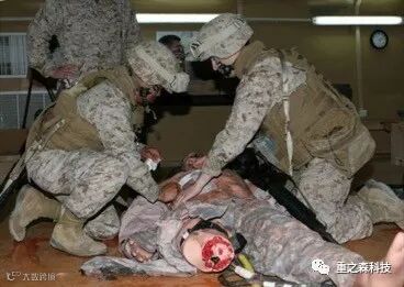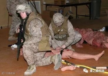 这是美国军队培训部门为让军人更好地认识伤口及一些救治手段,而用模拟人做止血包扎的场景。